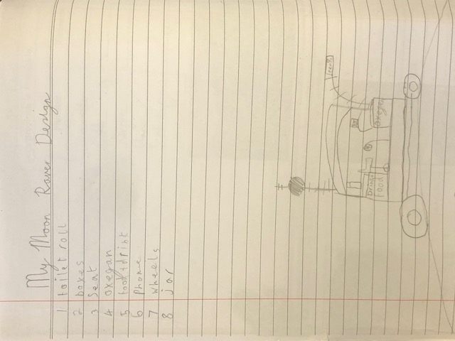 3rd class were learning about the Solar system. They discussed what a Moon rover would require, such as satellite, storage, ability to move on a rough surface, instruments for collecting materials. They then designed their vehicle and built them from recycled materials.
