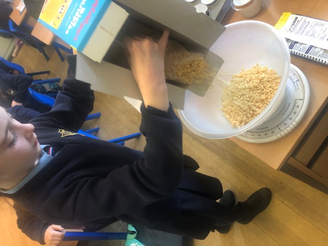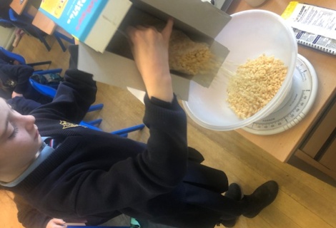 3rd class made Rice Krispie buns today. Before they started, they had to multiply the quantities so there would be enough buns for everyone, then they used the weighing scales to weigh out the chocolate and rice krispies. Everyone had a job, from measuring to mixing, to spooning mixture into the cases to adding the malteser on top. Everyone enjoyed the activity and of course thoroughly enjoyed eating them afterwards!