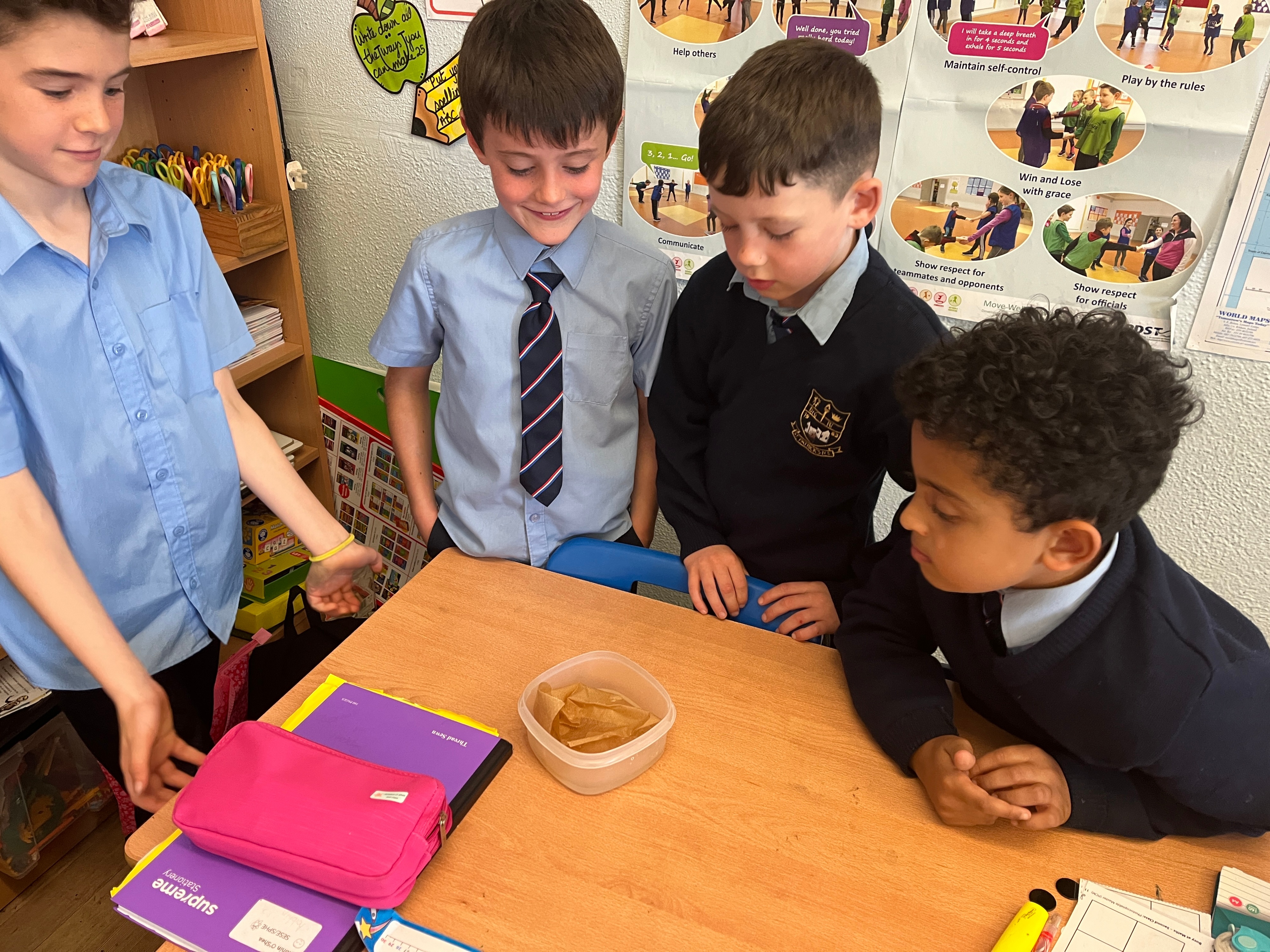 2nd class were learning about materials being waterproof or absorbent and carried out an investigation into which material was the most absorbent. To keep the test fair, they used the same size for each material being tested. Each material was tested using 100ml of water. Before testing, pupils predicted which material they thought would be the most and least absorbent. The materials tested were tissue, baking paper, a kitchen cloth, tin foil and a thick, dusting cloth. As they predicted, the most absorbent was the thick cloth, abosrbing 70ml of water in 1 minute!